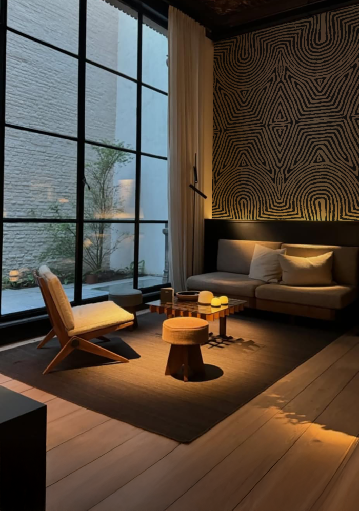 Le papier peint KANCHI affirme un caractère fort et contemporain. Ses lignes organiques, tracées à la main, composent une géométrie hypnotique qui joue avec la lumière et la profondeur.