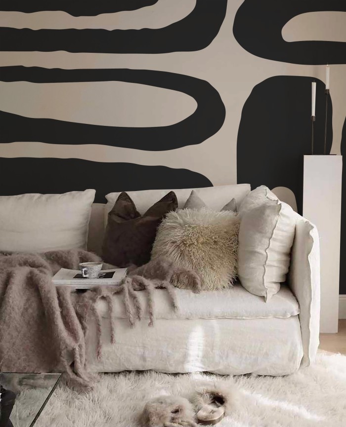 Ce papier panoramique présente un motif audacieux et moderne de formes organiques noires sur un fond beige. Les contours irréguliers et les contrastes forts créent une atmosphère dynamique et contemporaine. Ce design unique apporte une touche de créativité et d’originalité, parfait pour transformer n’importe quel espace avec une esthétique avant-gardiste et sophistiquée.