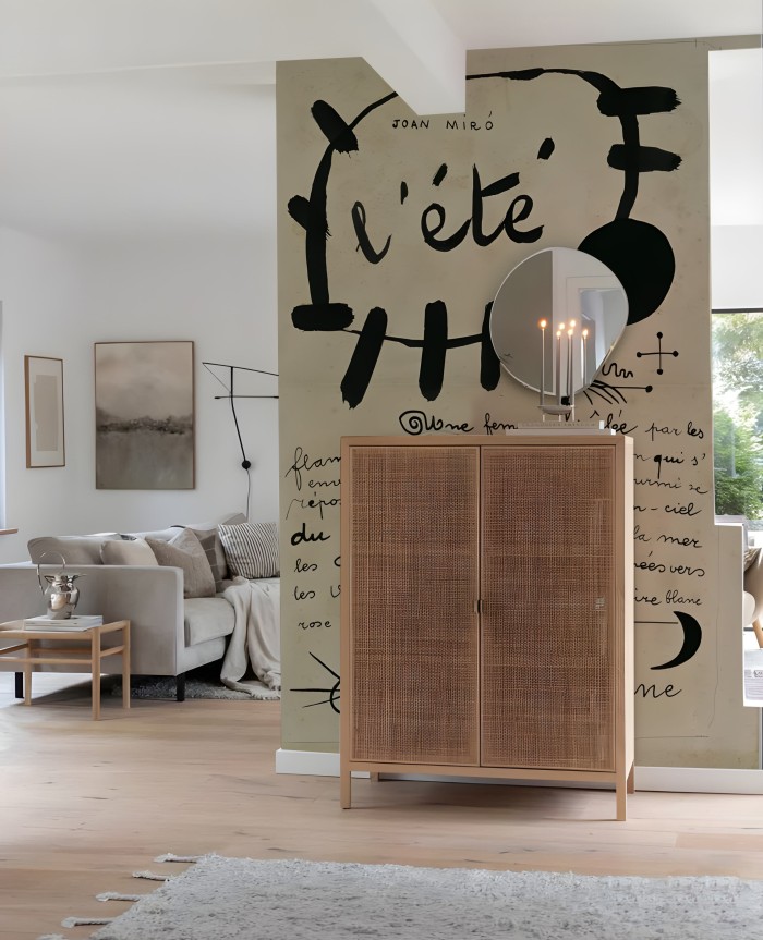 Le papier panoramique « L’été » propose une interprétation artistique audacieuse et poétique, inspirée de l’Å“uvre de Joan Miró. Ce design présente des formes abstraites et des lignes fluides qui s’entrelacent avec des éléments manuscrits, évoquant un texte poétique évoquant l’été. La palette de couleurs, dominée par des tons noirs sur fond clair, apporte un contraste saisissant, tout en évoquant l’énergie et la chaleur de la saison estivale. Ce papier peint est un véritable hommage à l’art contemporain, idéal pour créer une atmosphère artistique et sophistiquée dans votre espace intérieur.